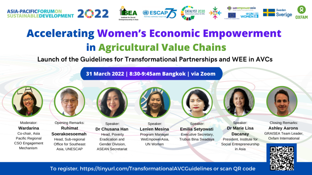 The Institute for Social Entrepreneurship in Asia (ISEA), UNESCAP Subregional Office for South-East Asia, UN Women WeEmpowerAsia, Catalyst 2030, Oxfam, Embassy of Sweden, and Asia Pacific Regional CSO Engagement Mechanism- Social and Community Enterprise Constituency are organizing a roundtable discussion on Accelerating Women’s Economic Empowerment (WEE) in Agricultural Value Chains on Thursday, March 31, from 8:30 AM to 9:45 AM (GMT+7, Bangkok, Thailand).
