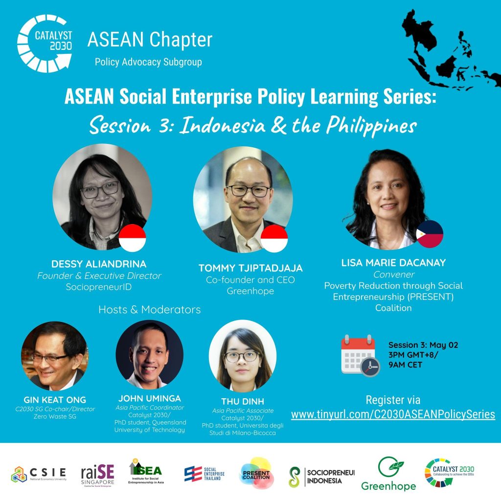The Catalyst 2030 Asia & the Pacific‘s ASEAN Social Enterprise Policy Learning Series Session #3 set to feature Indonesia and the Philippines. ISEA President and PRESENT Coalition Convenor, Marie Lisa Dacanay is one of the session’s speakers representing Philippines.