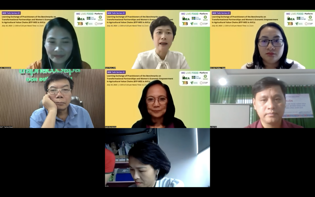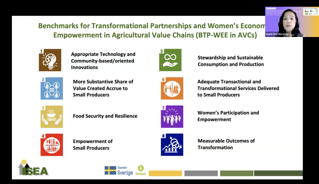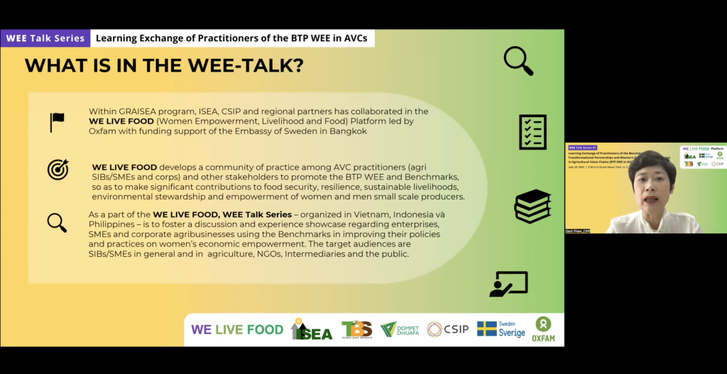 On the month of July and August, the Institute for Social Entrepreneurship in Asia (ISEA) and its WEE partners organized a WEE Talk Series featuring its implementing partners from three countries: Vietnam, Indonesia, and the Philippines. The series of Learning Exchange on the Benchmarks for Transformational Partnerships and Women’s Economic Empowerment in Agricultural Value Chains (BTP WEE in AVCs or Benchmarks) with Practitioners showcased the experiences and learning of 16 social enterprises, SMEs and corporate agribusinesses using the Benchmarks in improving their policies and practices on women’s economic empowerment and in partnering with their women and men small scale producers.