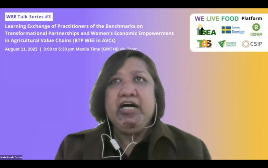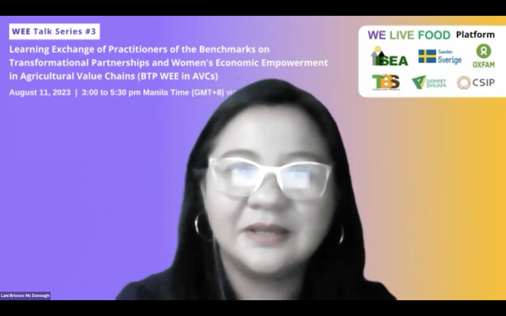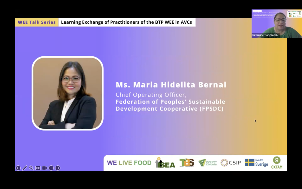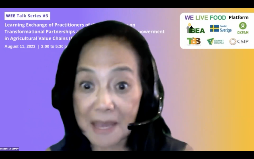 The third learning session of the series happened onAugust 11, 2023 featuring Philippine WEE implementing partners as follows: Marie Lisa Dacanay – President, Institute for Social Entrepreneurship in Asia (ISEA); Mabi David – Advocacy and Partnership Lead, Good Food Community; Maria Pamela Castro – Senior Program Manager for Livelihood, Food Security and Nutrition, Pilipinas Shell Foundation, Inc.(PSFI); and Maria Hidelita Bernal – Chief Operating Officer, Federation of Peoples’ Sustainable Development Cooperative – FPSDC.