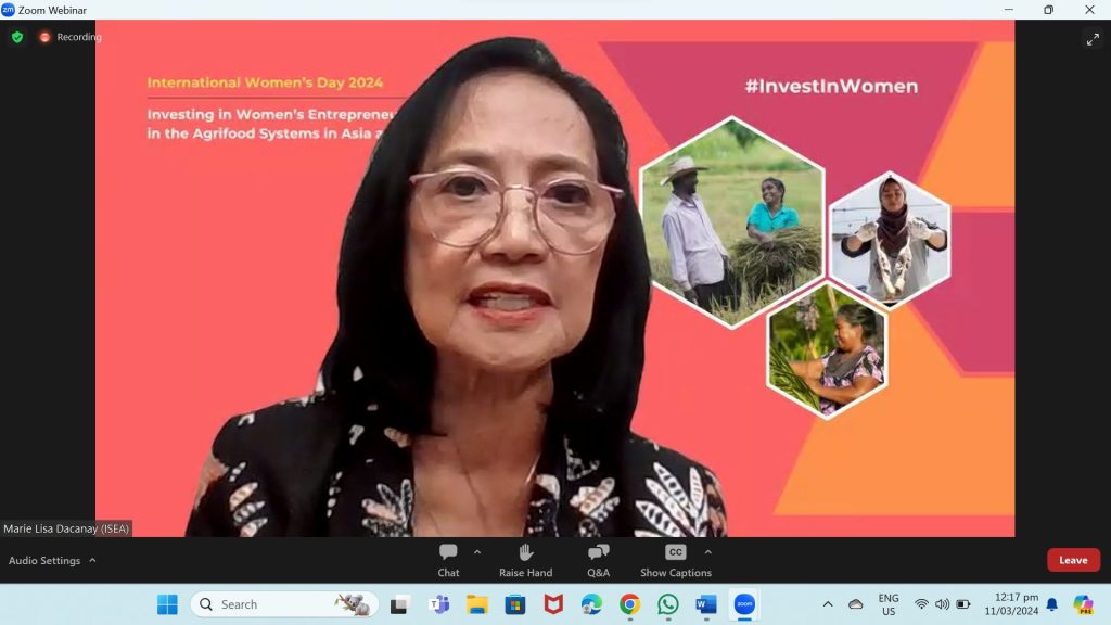 To mark International Women’s Day (IWD) 2024, the Food and Agriculture Organization of the United Nations (FAO) and International Fund for Agricultural Development (IFAD) held a virtual event titled, “Investing in Women’s Entrepreneurship in Agrifood Systems in Asia and the Pacific” last 11 March 2024 (Monday) from 10:00 am – 11:30 am Bangkok Time (11:00 am Beijing/Manila Time). ISEA President, Dr Marie Lisa Dacanay was one of the speaker-panelists of the said event.