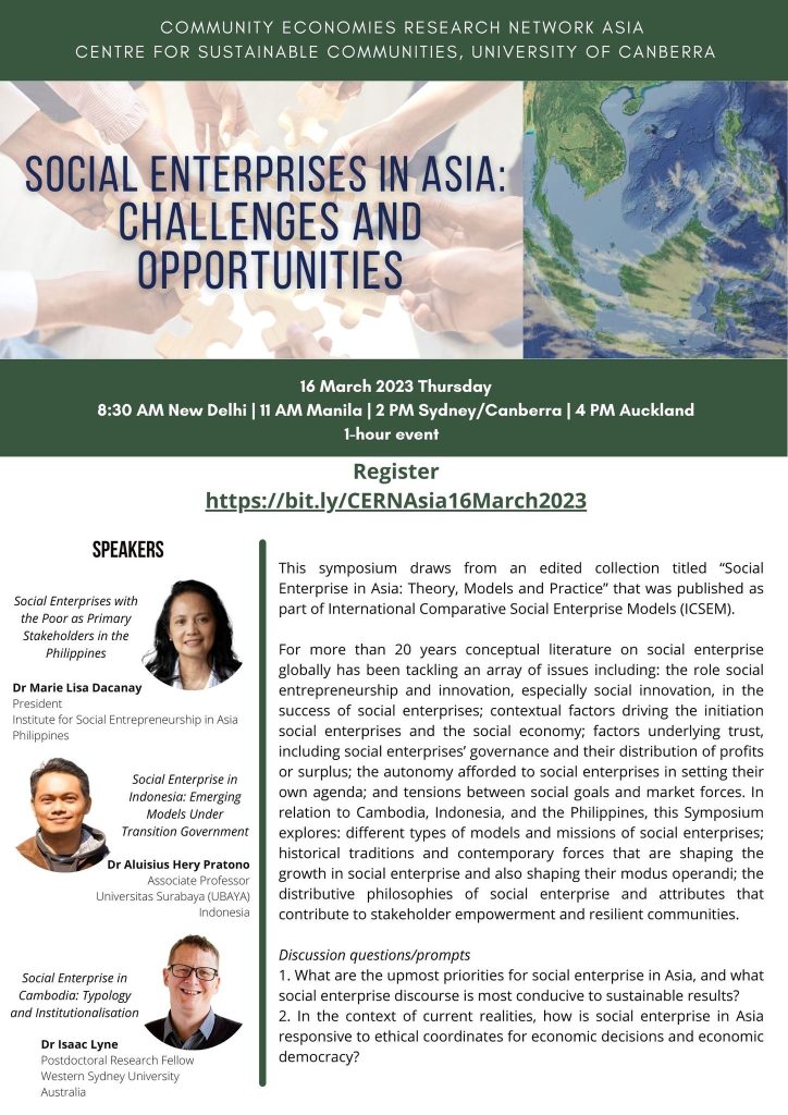 The Community Economies Research Network (CERN) Asia Centre for Sustainable Community of the University of Canberra held an online symposium, “Social Enterprises in Asia: Challenges and Opportunities” on 16th March 2023 (Thursday) at 8:30 AM New Delhi | 11 AM Manila | 2 PM Sydney/Canberra | 4 PM Auckland. One of the speakers, ISEA President, Dr Marie Lisa Dacanay presented “Social Enterprises with the Poor as Primary Stakeholders in the Philippines”.
